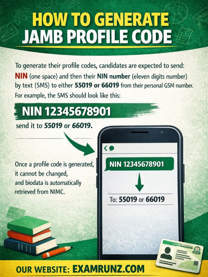 To generate their profile codes, candidates are expected to send: NIN (one space) and then their NIN number (eleven digits number) by text (SMS) to either 55019 or 66019 from their personal GSM number. For example, the SMS should look like this; “NIN 12345678901” (without the quotation marks); send it to 55019 or 66019. Remember, “12345678901” should be your own NIN.