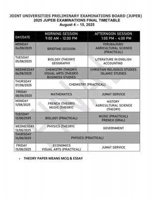 This is to inform the general public especially andidates of the 2025 Joint Universities Preliminary Examination Board (UPEB) that the Jupeb 2025 Examination Timetable has been released.