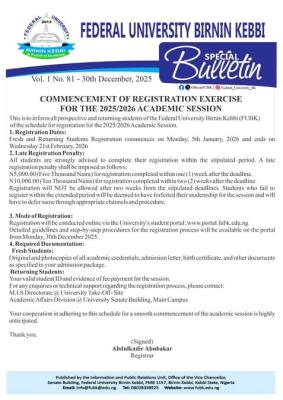 The Management of the Federal University Birnin Kebbi (FUBK) wishes to inform all prospective (fresh) and returning students of the approved schedule for the registration exercise for the 2025/2026 Academic Session