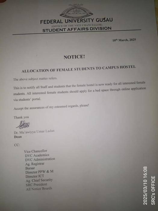 The management of the Federal University Gusau (FUGUS) wishes to notify all staff and students that the female hostel is now ready for all interested female students. All interested female students should apply for a bed space through online application via students’ portal.