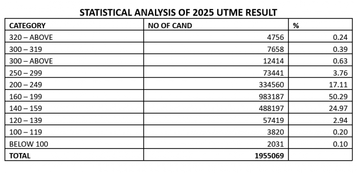 JAMB has released the statistical analysis of the 2025 UTME results. According to the information released by JAMB, the majority of the candidates scored between 160 and 199. Check the statistics on the image below;