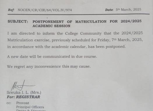 This is to inform the College Community that the 2024/2025 Matriculation exercise, previously scheduled for Friday, 7th March, 2025, in accordance with the academic calendar, has been postponed.