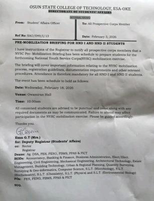 OSCOTECH schedules NYSC Pre-mobilization Briefing for HND Students