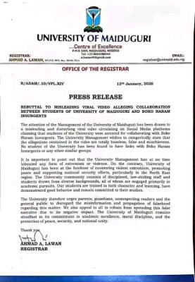 “The University Management has at no time tolerated any form of extremism or violence. On the contrary, the University of Maiduguri has been at the forefront of countering violent extremism, promoting peace, and supporting national security efforts, particularly in the North East region,” the release stated.